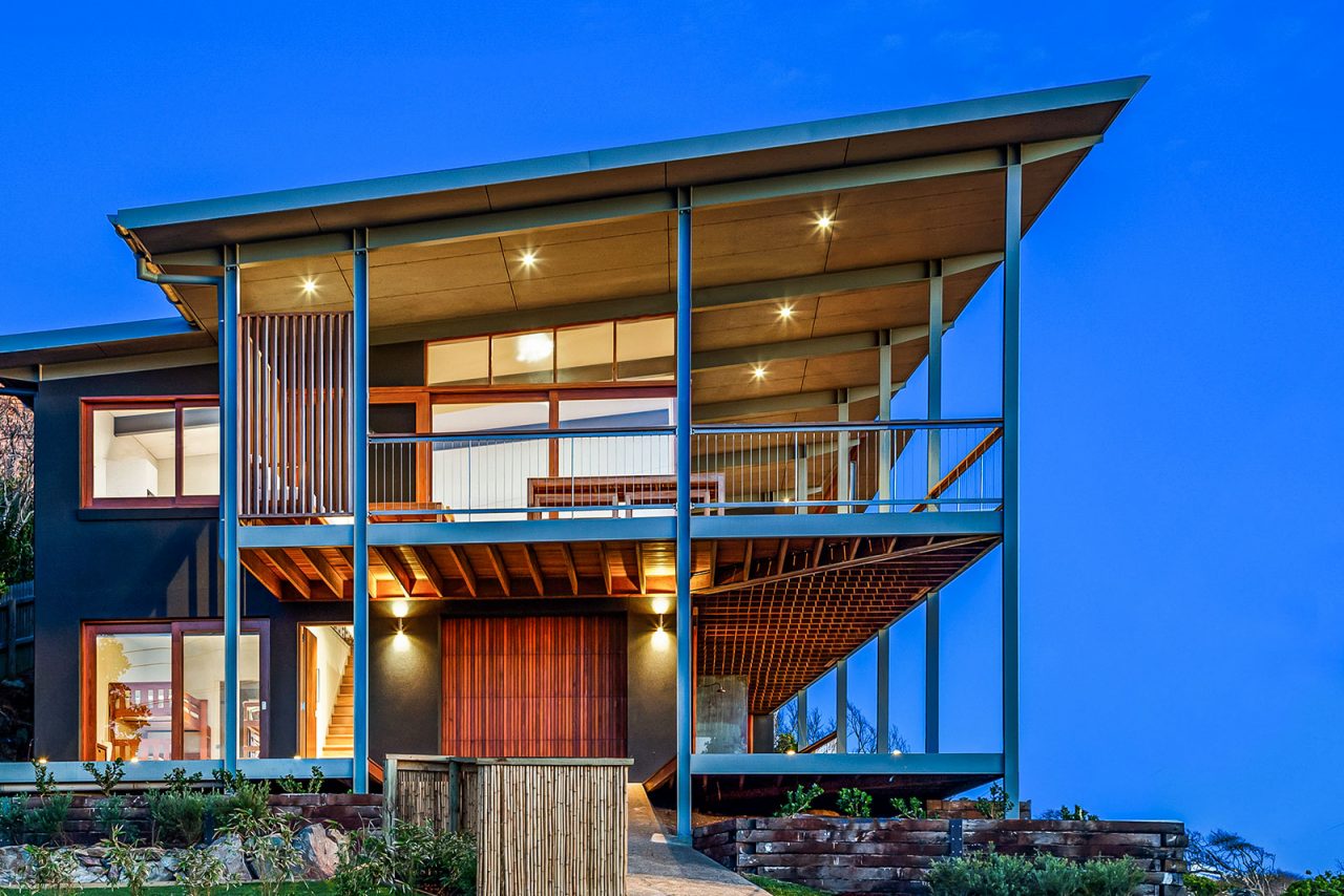 The open plan interior of the house and large enclosed deck necessitated some serious steel, with the shell of the fabrication developed around a large prefabricated steel portal structure. The design of the portal structure required significant input from ETA Constructions to ensure the safe erection on the steep site with the high voltage power lines always providing a challenge.